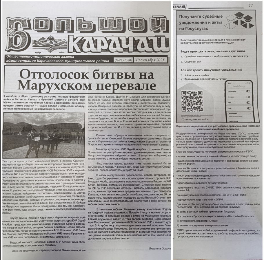 ![]() В очередном номере районной газеты «Большой Карачай» (№255 (380) от 10.10.2025) опубликована информационная статья, подготовленная Карачаевским районным судом, посвященная преимуществам и возможностям ГЭПС (Государственной электронной почтовой системы), функционирующей на основе ГАС «Правосудие» для граждан. Данная публикация является частью последовательной работы суда по повышению правовой грамотности населения и открытости судебной системы. Основная цель – наглядно и доступно разъяснить жителям района, как современные технологии делают взаимодействие с судом более удобным, быстрым и прозрачным. «Внедрение и активное использование ГЭПС – это важный шаг в развитии современного правосудия, – отметил председатель Карачаевского районного суда Тарасов М.В. – Мы стремимся идти в ногу со временем и создавать для граждан максимально комфортные условия для реализации их прав. Наша статья в «Большом Карачае» призвана помочь каждому жителю района оценить эти удобства и начать активно ими пользоваться». |