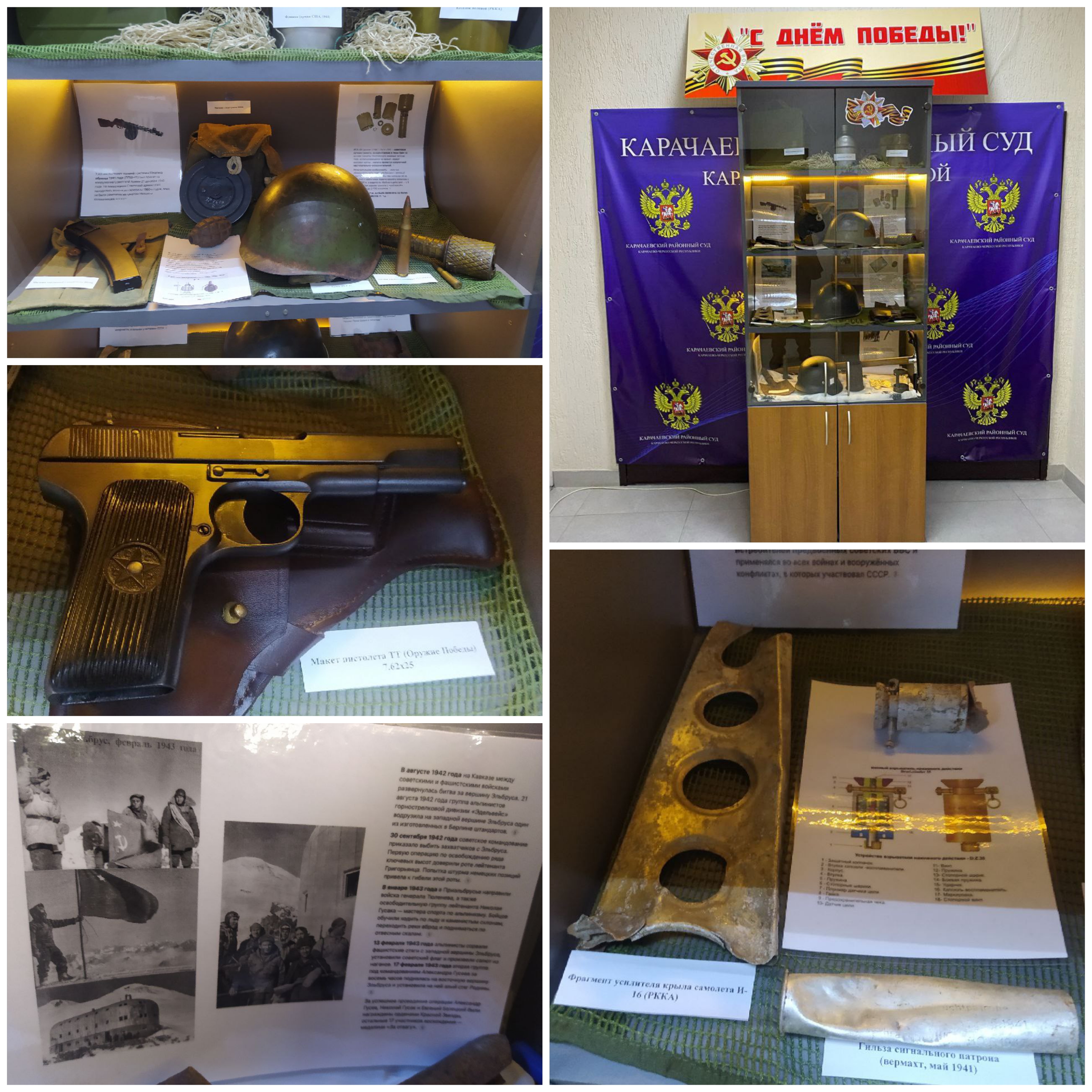 В Карачаевском районном суде организована посвященная 9 мая небольшая выставка. Здесь представлены элементы подлинного боевого снаряжения, макет оружия и другие экспонаты военных лет. Выставка вызывает неподдельный интерес как у сотрудников суда, так и у посетителей! Вечная память нашим Героям!![]() |